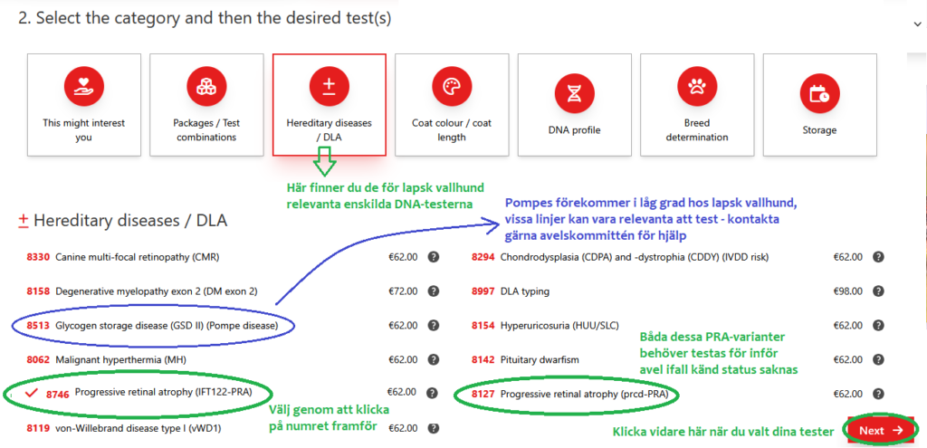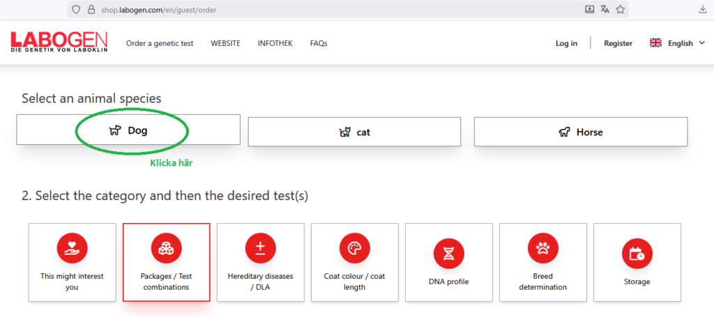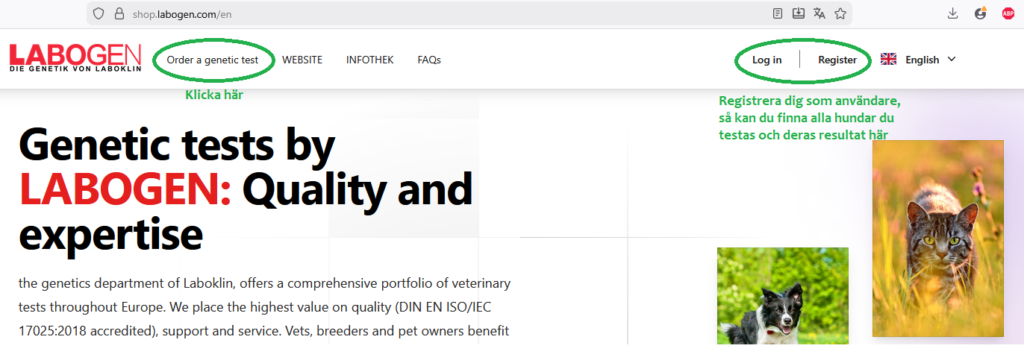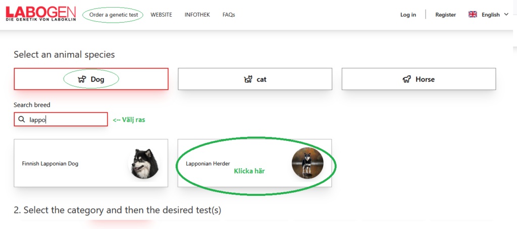 Denna lathund visar hur man beställer från Labogen, vilket är det lab vi rekommenderar eftersom samtliga relevanta tester för lapsk vallhund finns där.