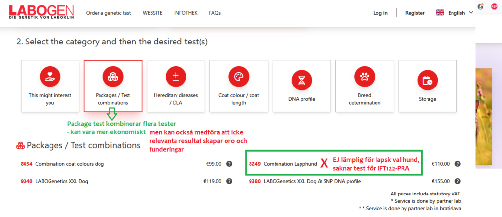 Pakettester är ofta ekonomiskt smidigt, men kan också ge information som är svår att hantera - exempelvis påvisade sjukdomsanlag på sjukdomar som inte förekommer i rasen och där testet inte är verifierat, dvs giltigt, för lapsk vallhund.