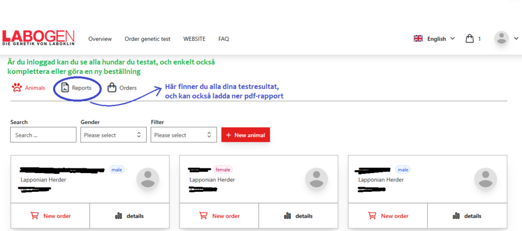 Som inloggad kan du se alla hundar du testad, och även enkelt finna samtliga testresultat antingen via hundens egen sida eller via fliken "Reports".
